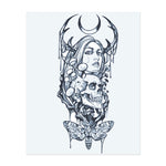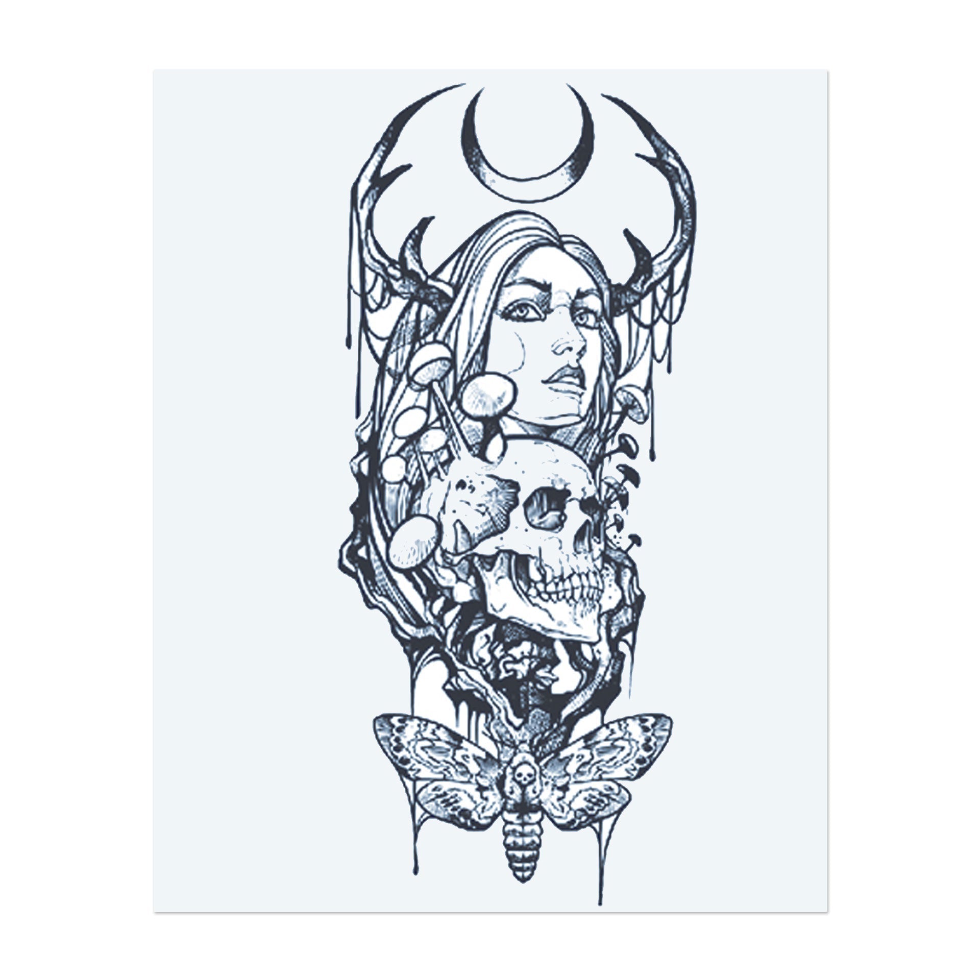 A mystical tattoo featuring a woman with antlers, surrounded by a skull, mushrooms, and a butterfly. The crescent moon above adds a touch of magic and mystery. This design symbolizes transformation, the balance between life and death, and the beauty of nature’s cycles.