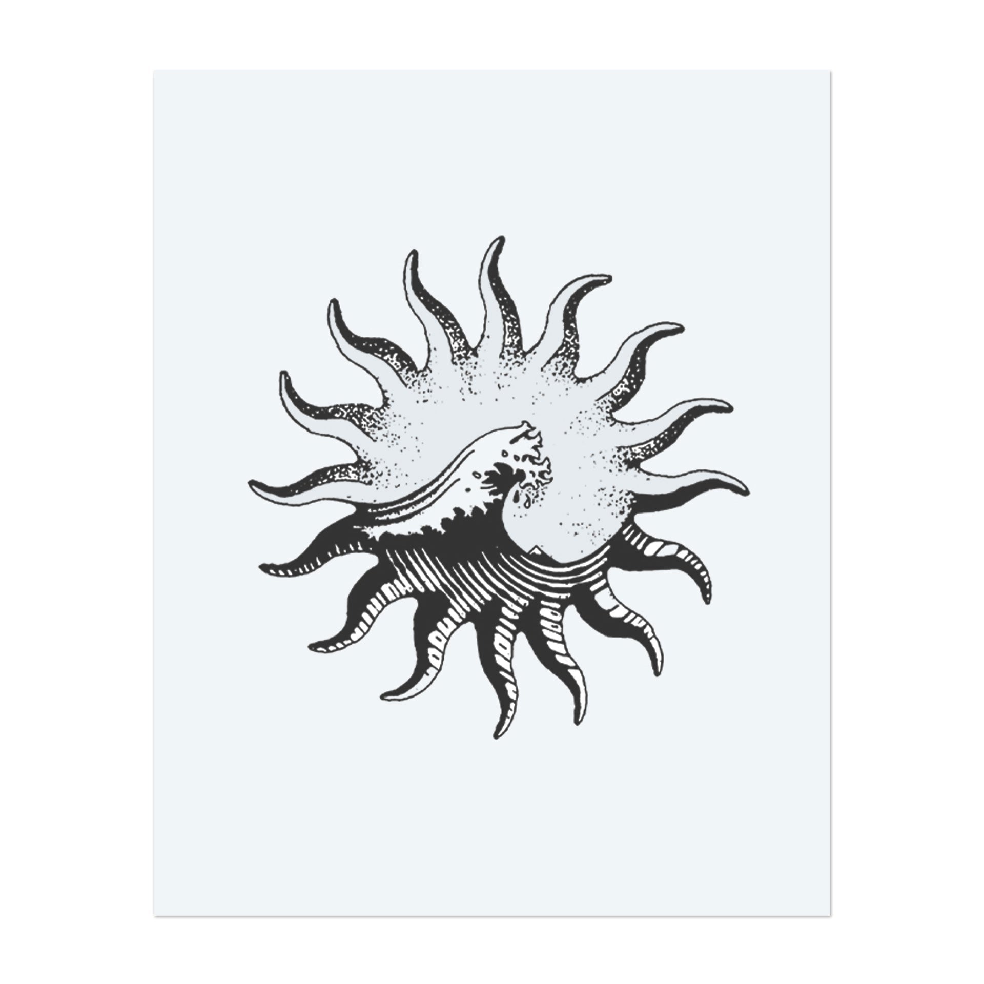 This unique tattoo combines a breaking wave with the radiant shape of a sun, its rays curling like tentacles. It unites elemental forces and symbolizes the balance between power and heat, chaos and light: a cosmic dance between sea and sky.