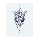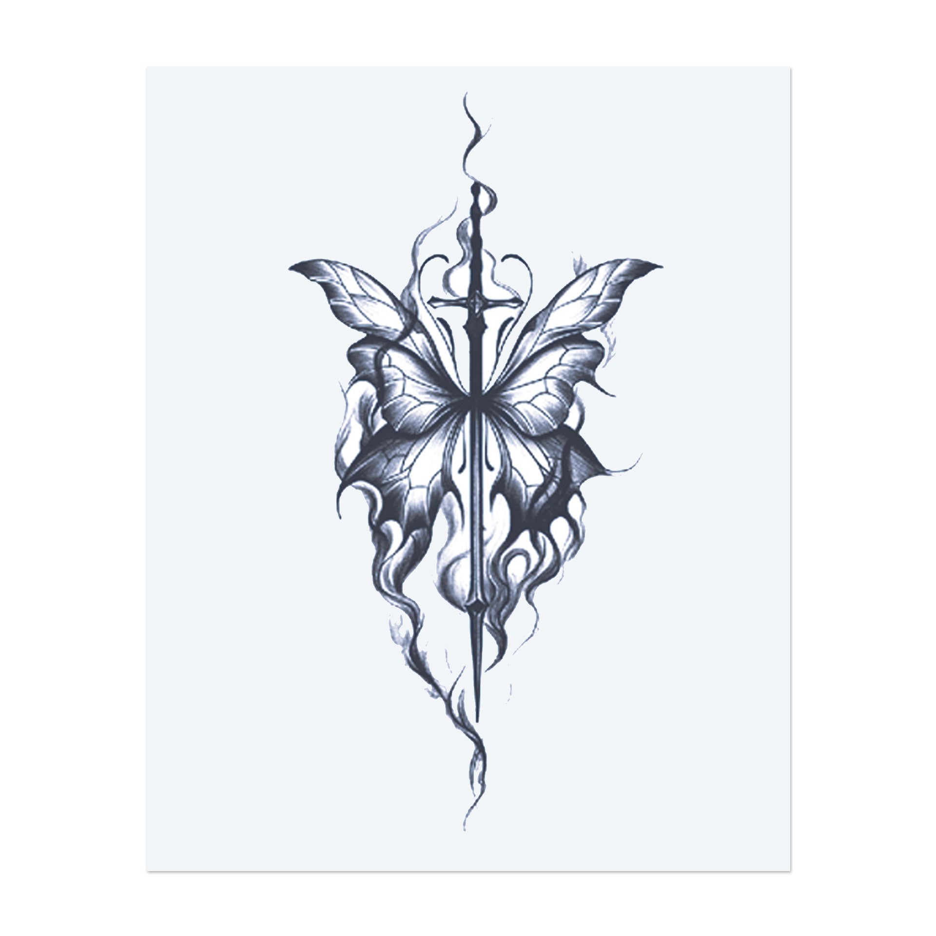A graceful butterfly with wings made from sharp, flowing flames, centered around a sword. The tattoo blends softness and strength, symbolizing transformation and resilience, with the sword cutting through the smoke of struggle.