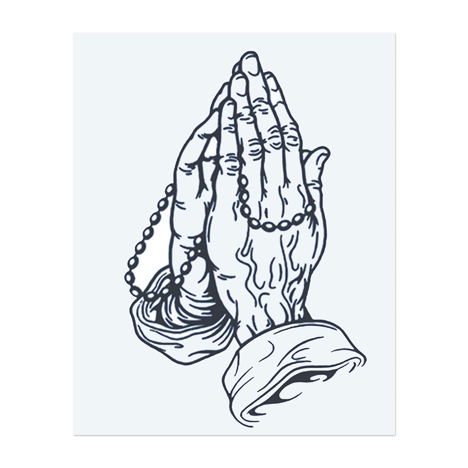 A detailed tattoo of two hands clasped in prayer, with a rosary draped between them. This design symbolizes faith, hope, and devotion. A beautiful choice for someone who values spirituality and seeks a peaceful, meaningful symbol.