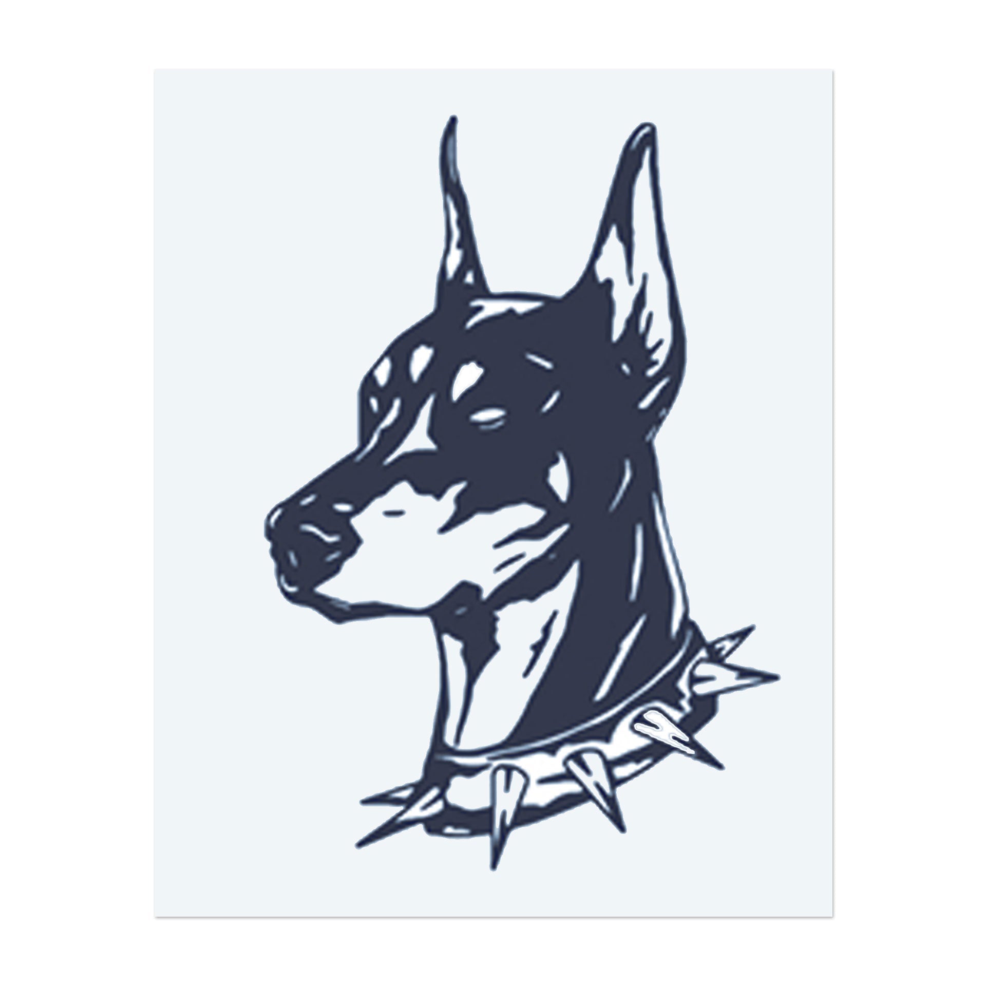 A Doberman head with a spiked collar. Represents loyalty, protection, or strength. A bold and powerful design.