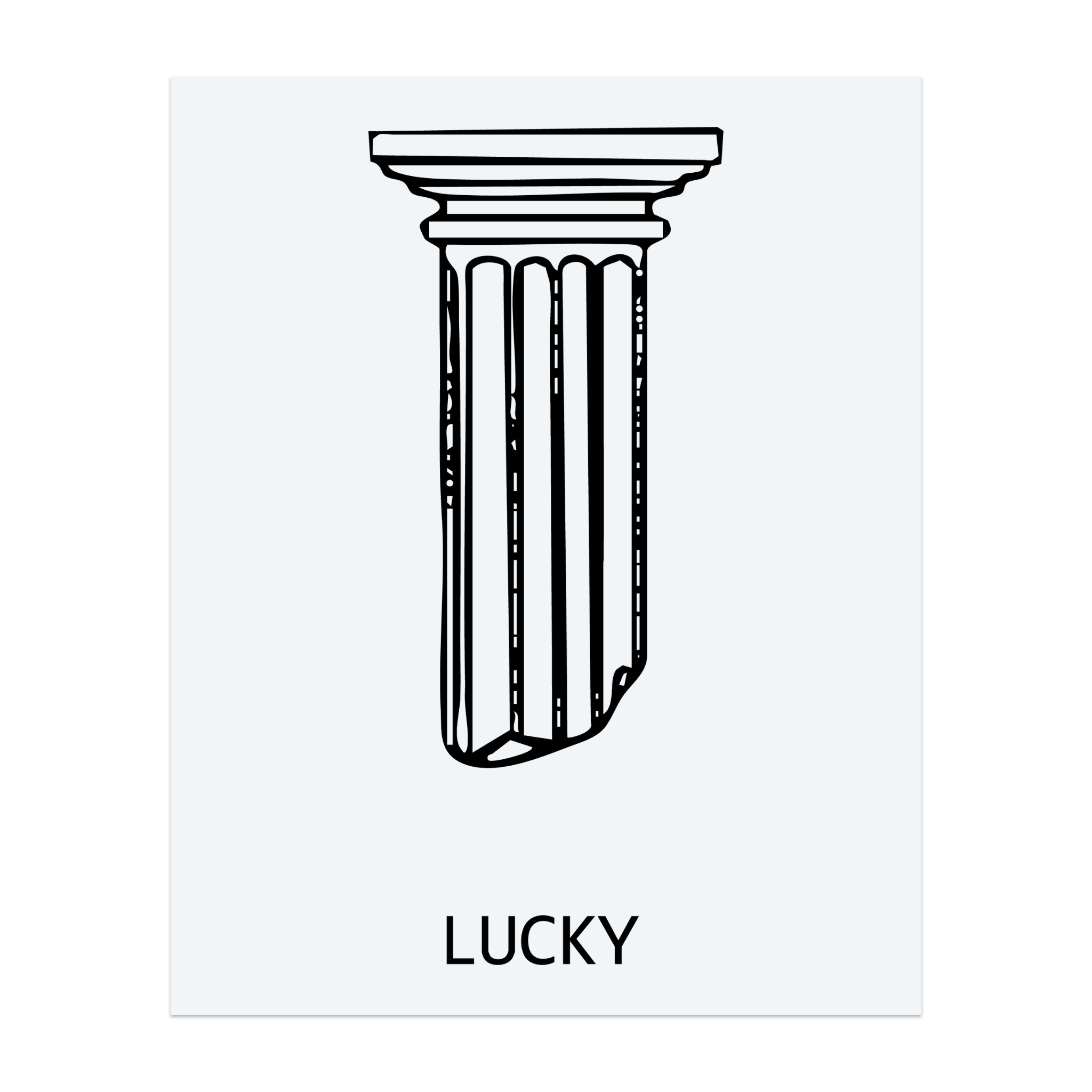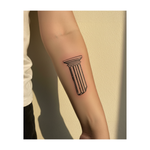 A bold minimalist tattoo of an ancient Greek column with the word “LUCKY” below it. It tells a story of strength, history, and good fortune standing tall through time.