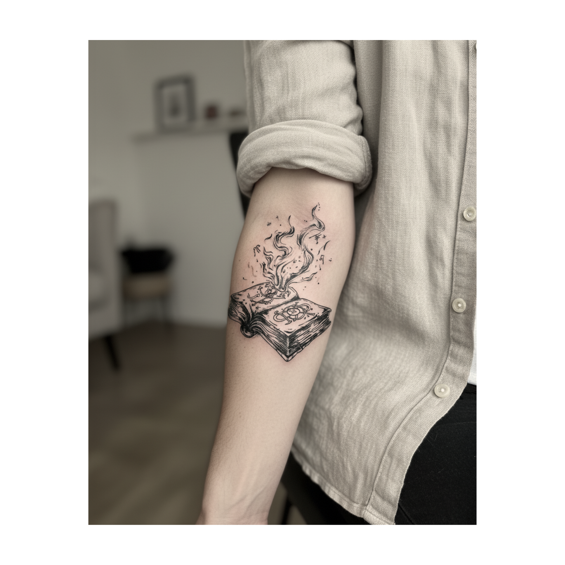 An ancient book glows with rising smoke and glowing runes. This blackwork tattoo shows magic coming alive from the pages of a wizard’s spellbook.