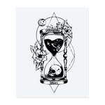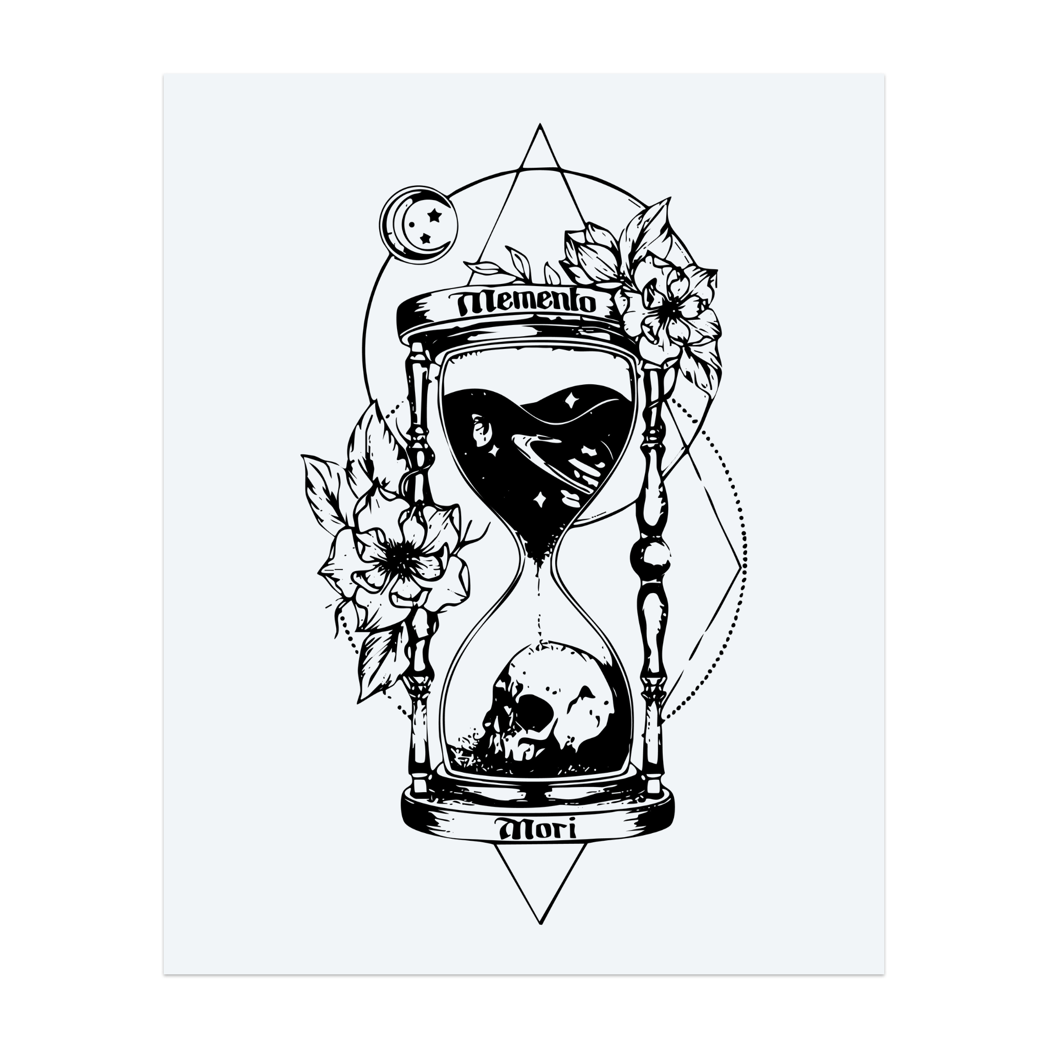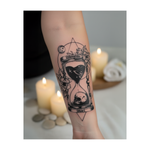 A detailed tattoo showing an hourglass with stars and a skull inside. Surrounded by flowers, a moon, and sacred shapes, it reminds us that time flows fast. The blackwork style makes it bold and deep.