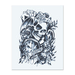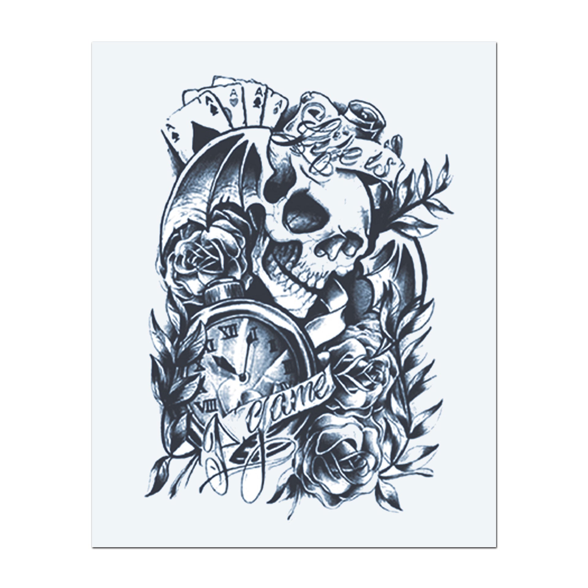 A skull with cards, a clock, and roses shows “Life is a game.” This realistic tattoo mixes time, luck, and beauty with bold shading and leaves, reminding us to live bravely.