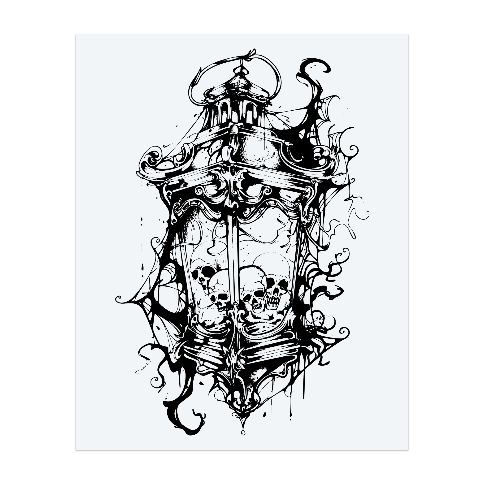 An old lantern glows with skulls trapped inside, wrapped in webs and smoke. This blackwork tattoo shines with dark mystery, like a light from a haunted world.