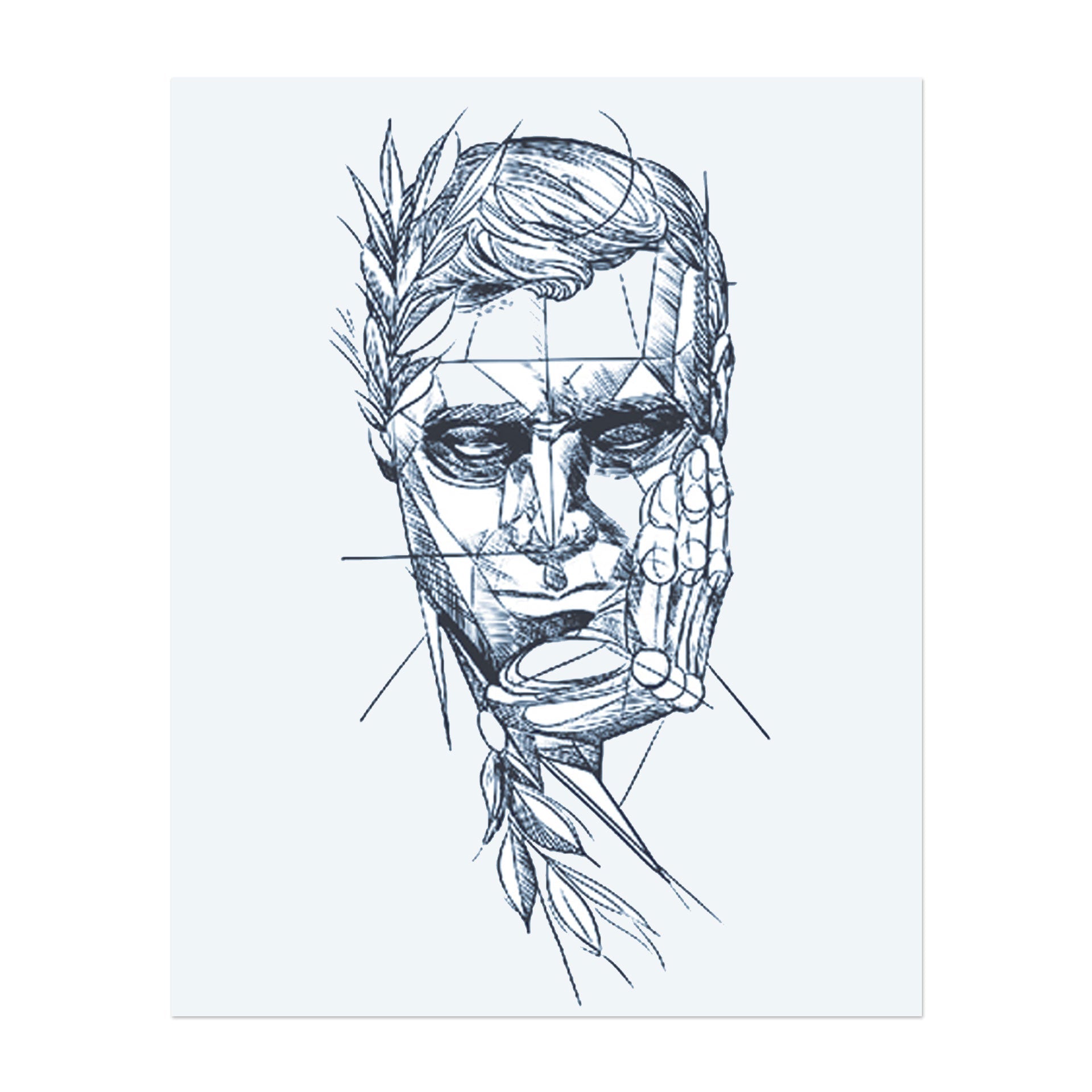 A geometric tattoo of a thoughtful face, with intricate lines and a laurel crown, symbolizing wisdom, intellect, and introspection. This design reflects the balance between strength and vulnerability, perfect for someone who values deep thought and personal growth.