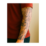 This sleeve features a majestic koi fish swimming upward through waves and surrounded by delicate flowers. It symbolizes strength, perseverance, and transformation, representing the journey to overcome obstacles.