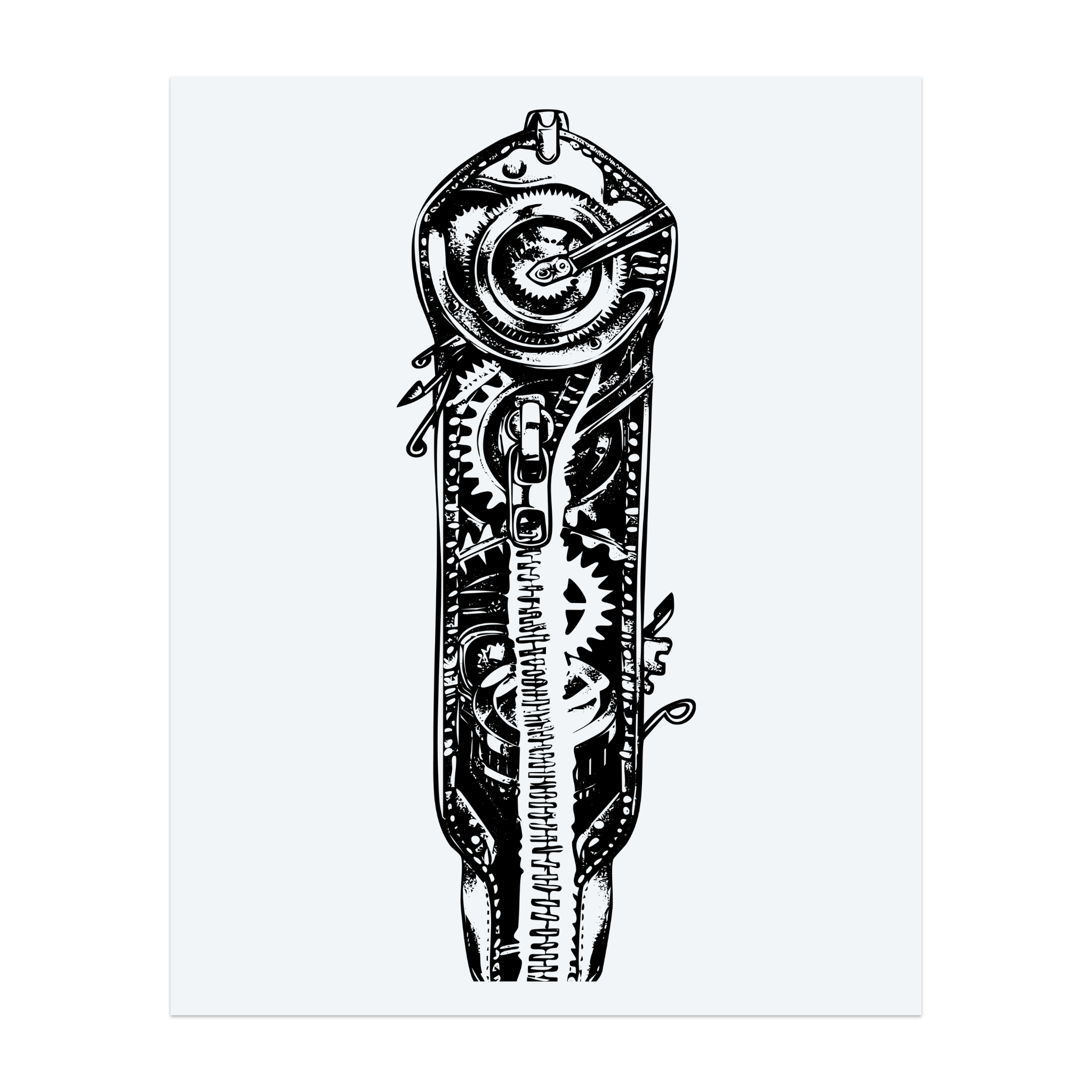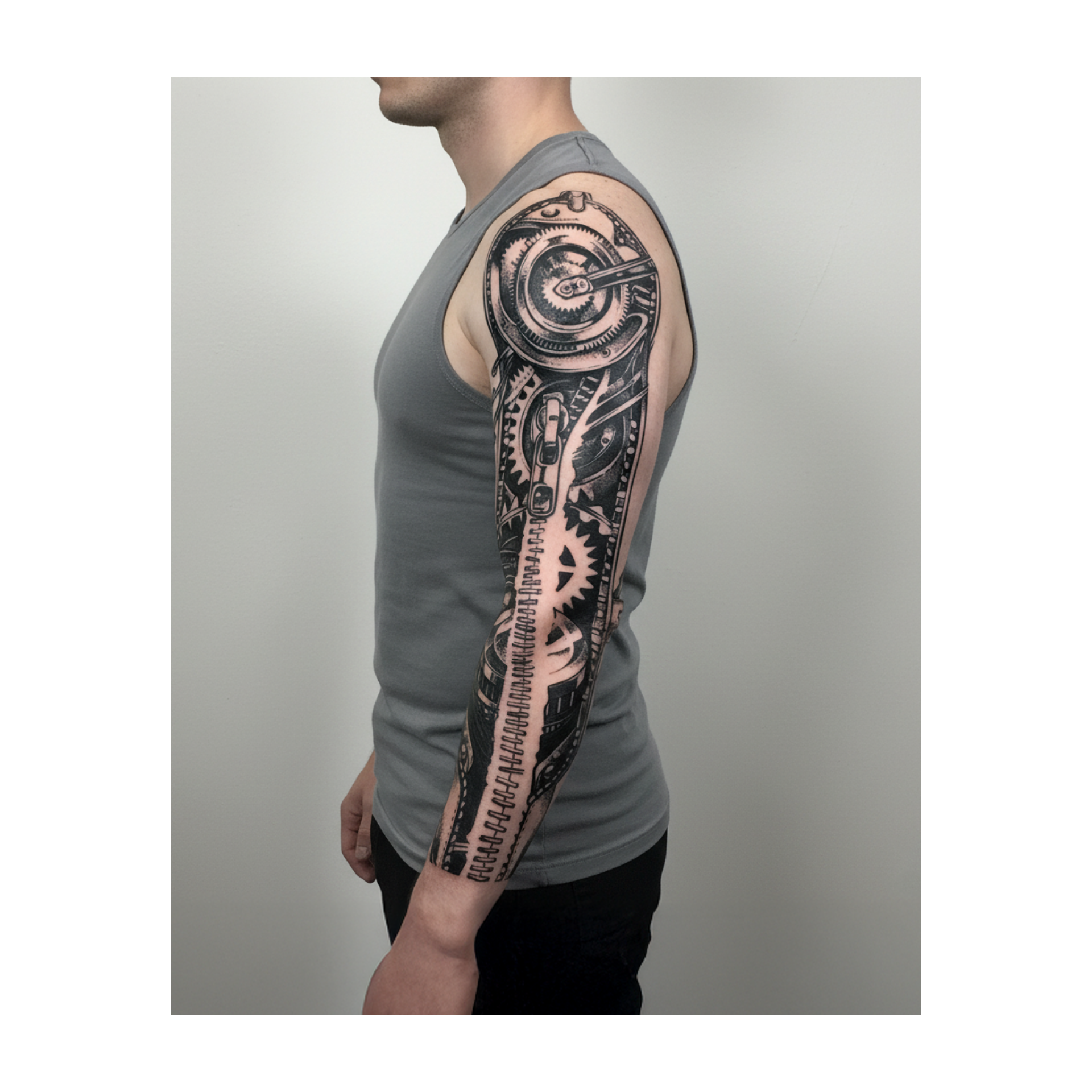 A zipper opens to reveal gears, screws, and metal parts inside, as if a robot hides beneath the skin. This steampunk-style tattoo mixes machine and human in a bold Halloween twist.