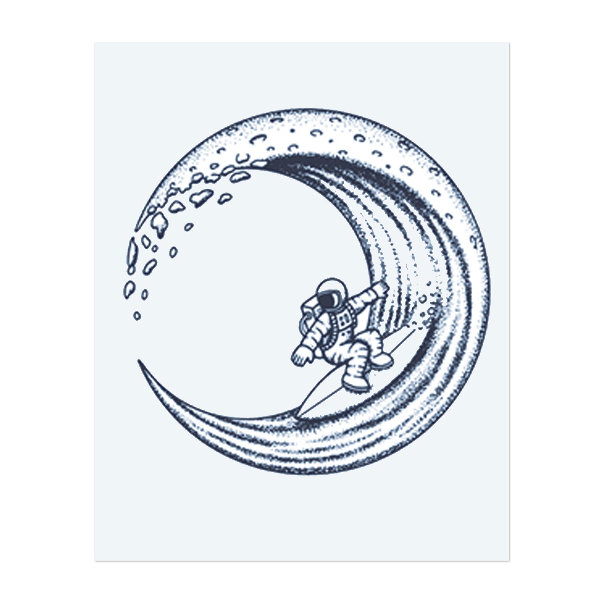A surfer (astronaut) riding a massive wave, blending the energy of the ocean with the thrill of the ride. This tattoo symbolizes adventure, freedom, and embracing the flow of life, perfect for those who live in pursuit of excitement and the beauty of nature.
