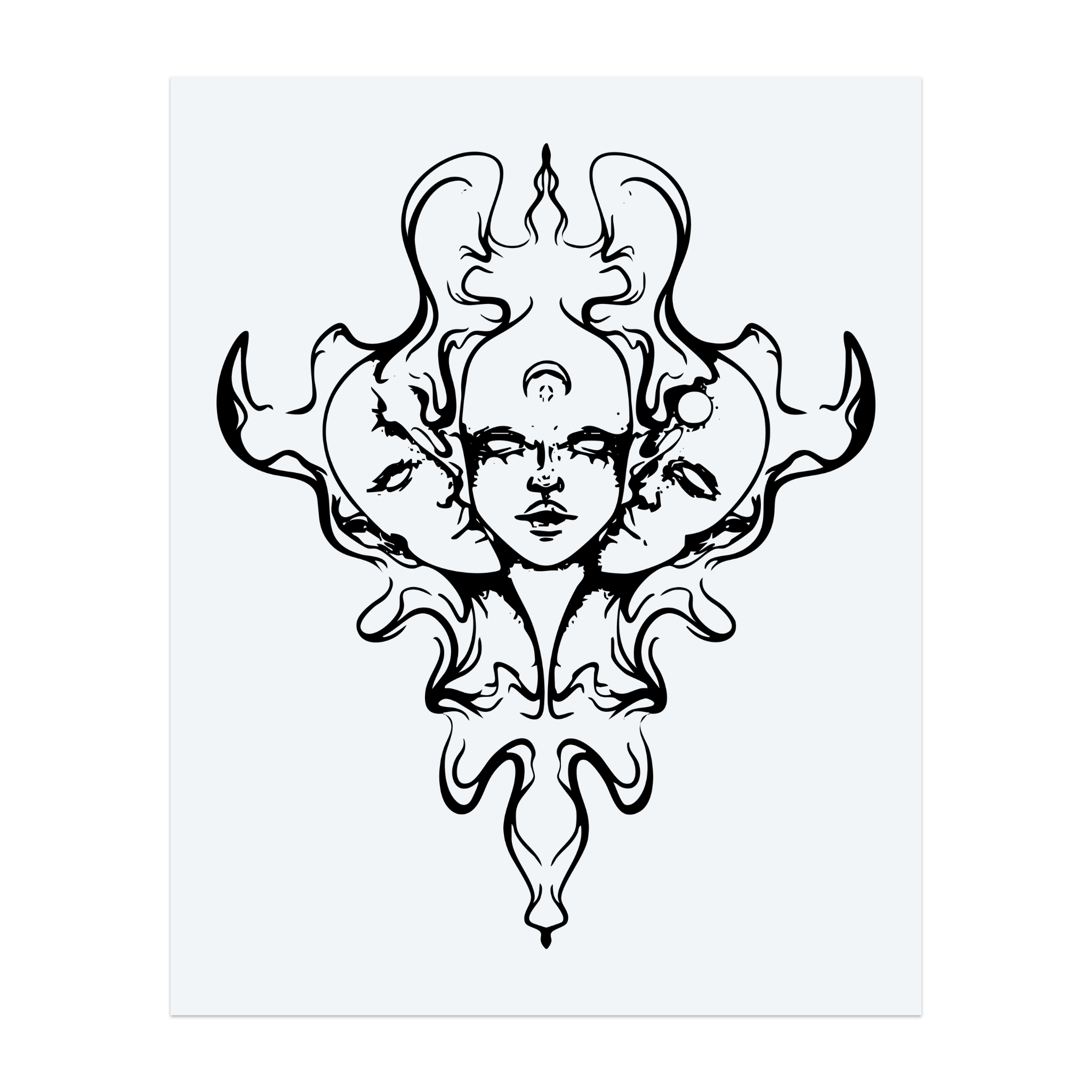 A blackwork tattoo of three faces—one in the center with a crescent moon, and two on the sides. Flowing shapes surround them, telling a story of balance, mystery, and the magic of night and dreams.