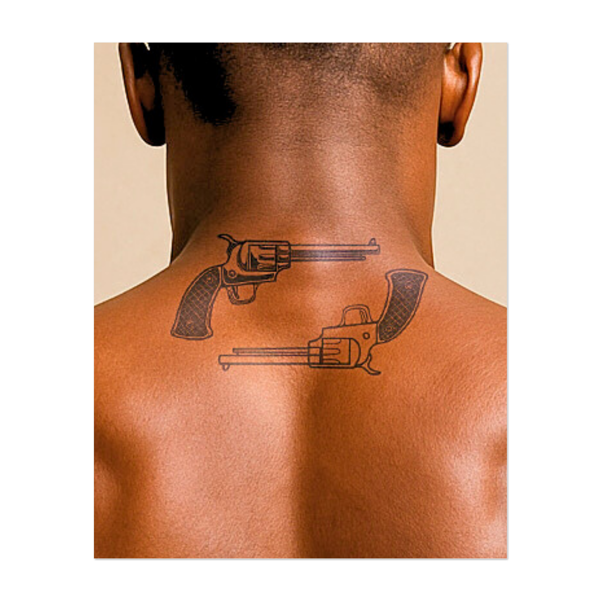 Two vintage revolvers, designed with intricate details. These guns symbolize power, rebellion, and the old-school Wild West spirit.