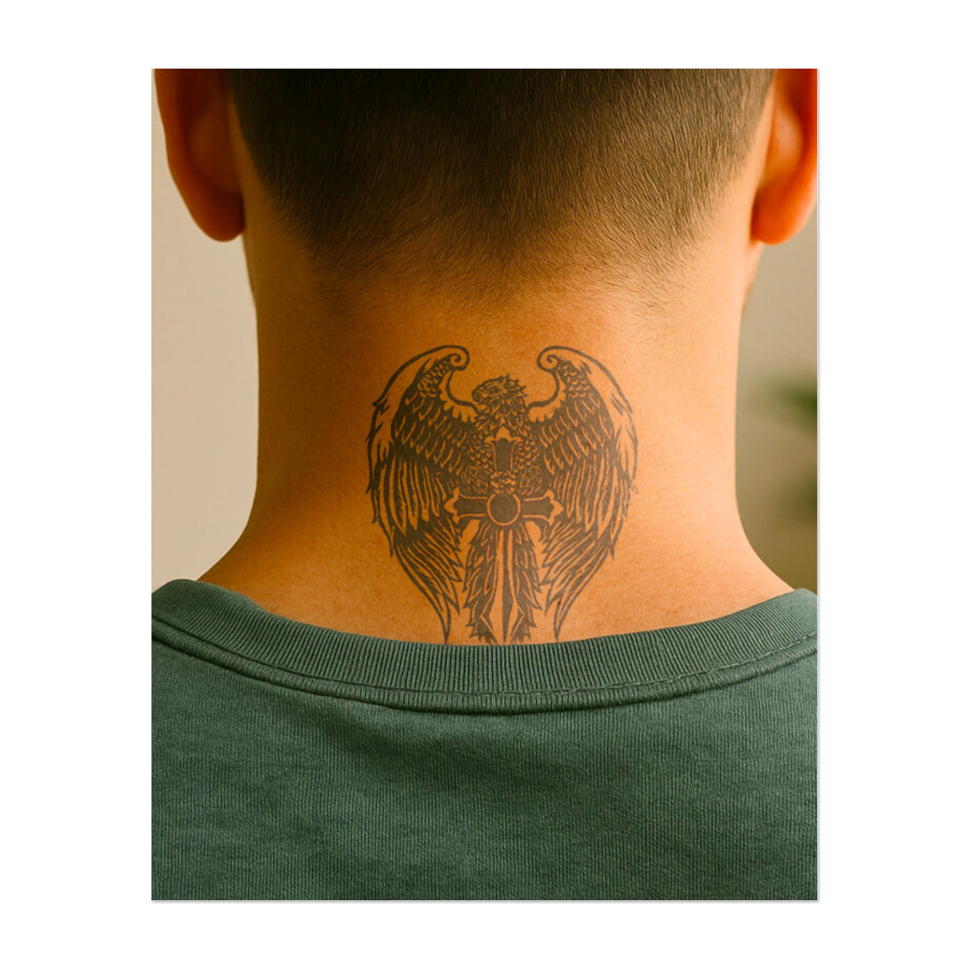 A pair of majestic wings surrounding a cross, symbolizing protection, strength, and faith. The design combines divine power with freedom, representing a balance between spiritual guidance and personal strength.