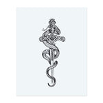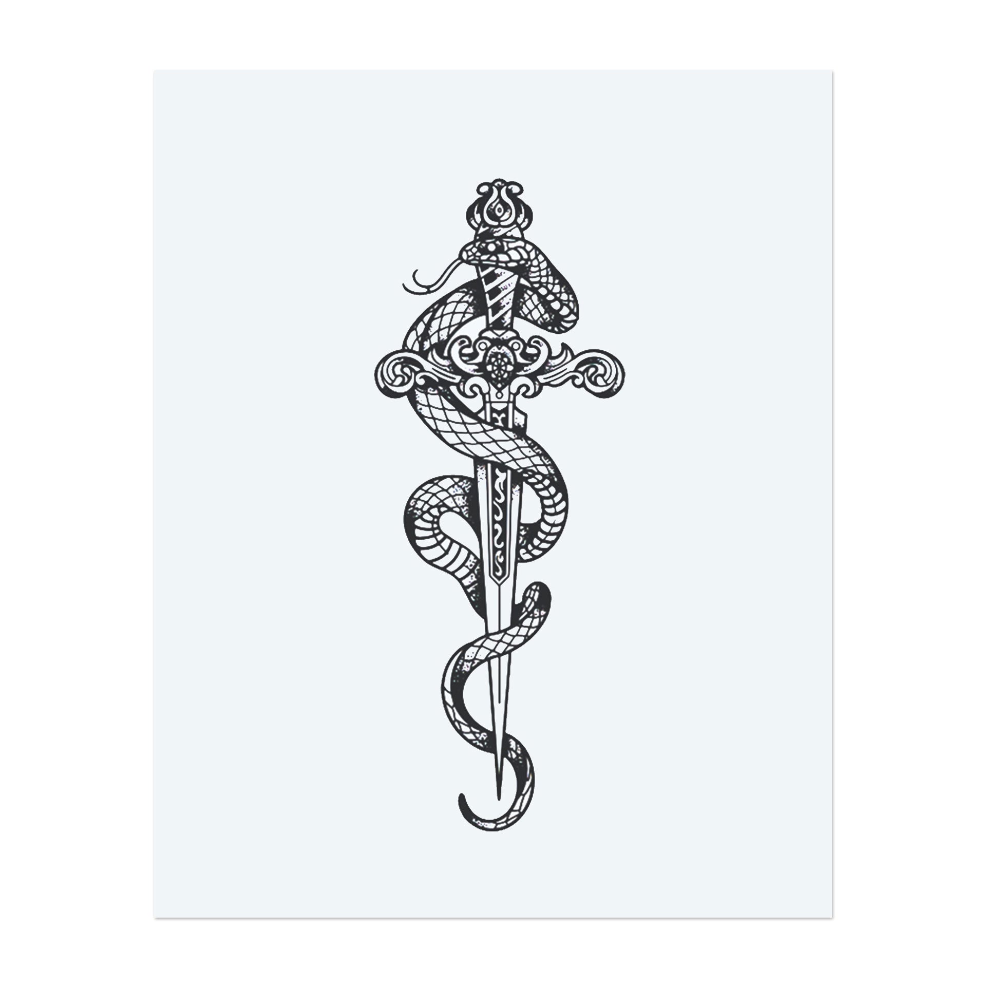 This intricate tattoo depicts a serpent coiled around an ornate dagger. Its tongue protrudes from a detailed head perched on the hilt. It symbolizes deadly elegance, duality, and protective wisdom, evoking the balance between danger and control.