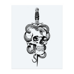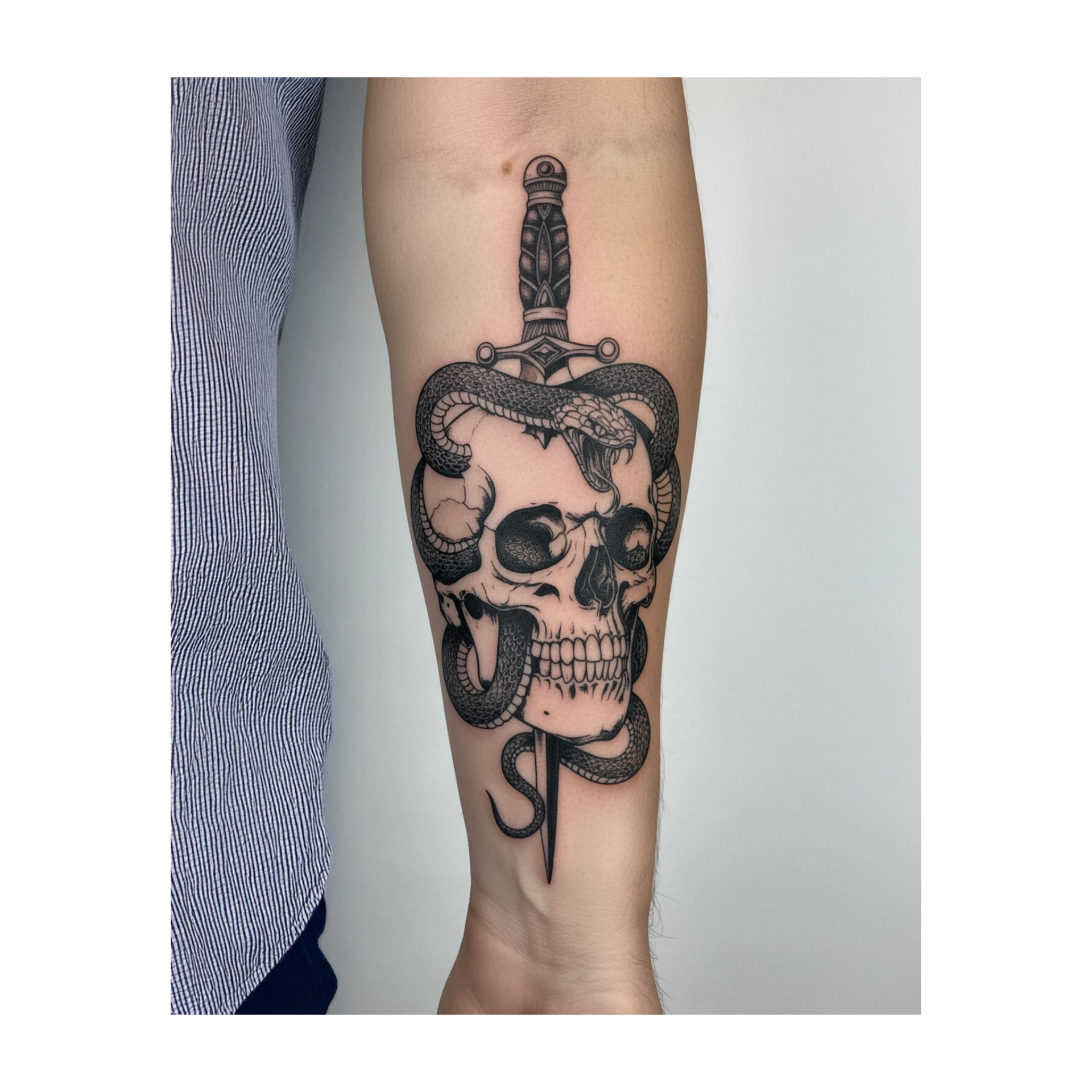 A sharp dagger pierces through a skull while a snake slithers around it, fangs ready to strike. This bold tattoo in dark gothic style shows death, danger, and hidden strength within shadows.