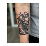 A bold blackwork tattoo of a knight in armor kneeling with a sword, arrows stuck in his back. It shows courage, sacrifice, and honor, telling the story of fighting on even when wounded.