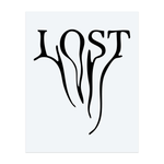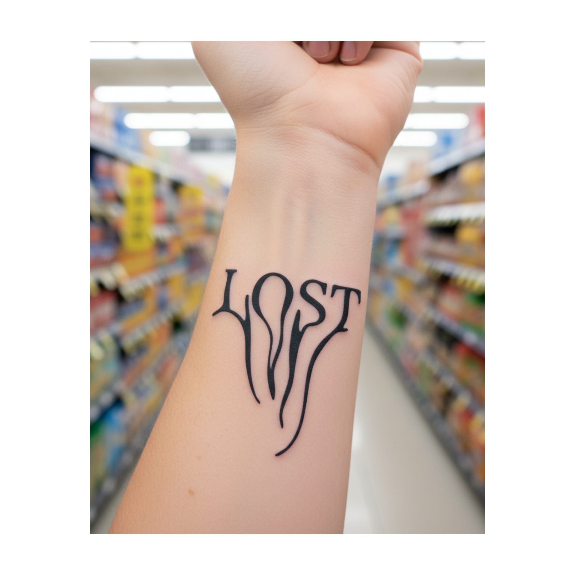A minimalist tattoo of the word “LOST,” with the letters stretching down like melting shadows. It tells a story of drifting feelings, giving a mysterious and artistic vibe.