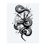 A bold blackwork tattoo of a snake coiled around a shattered clock with Roman numbers. It tells the story of time slipping away, danger, and power, showing how life and fate cannot be controlled.
