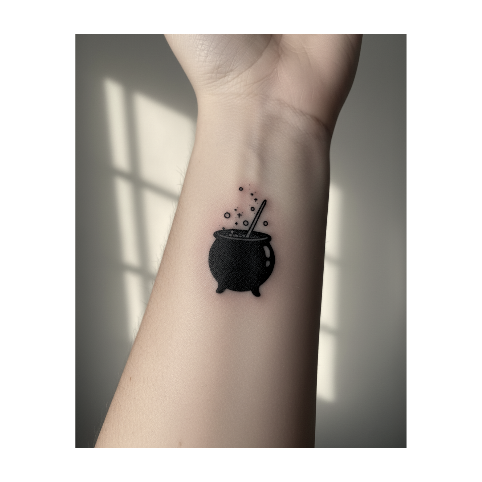 A bubbling cauldron tattoo filled with sparkles and magic! This blackwork design brings a dash of witchy charm — perfect for Halloween nights and potion masters at heart.